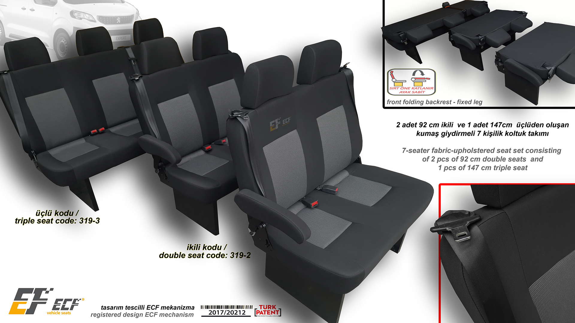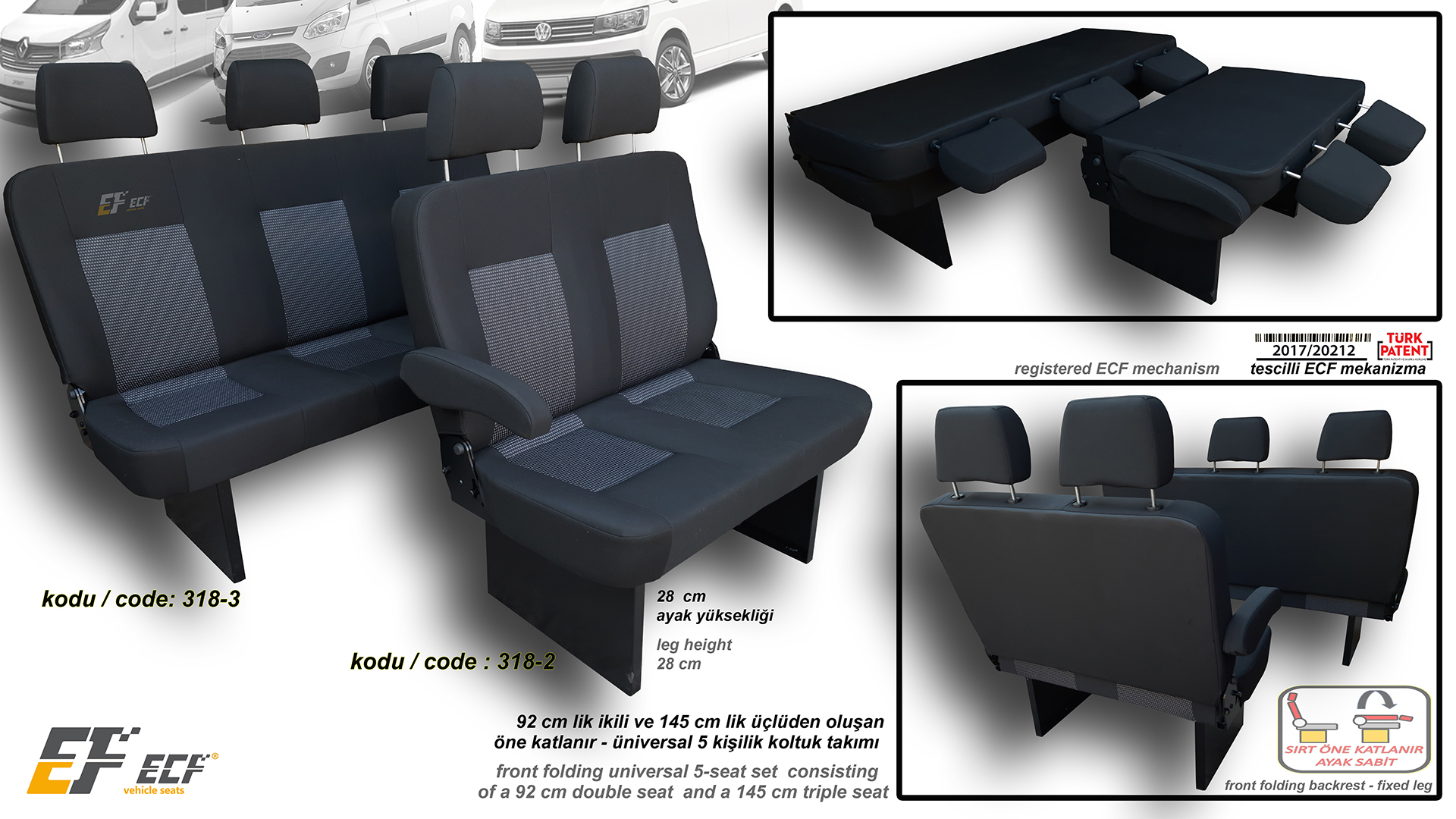 Front folding universal 5 seat set consisting of a 92 cm double seat and a 145 cm triple seat