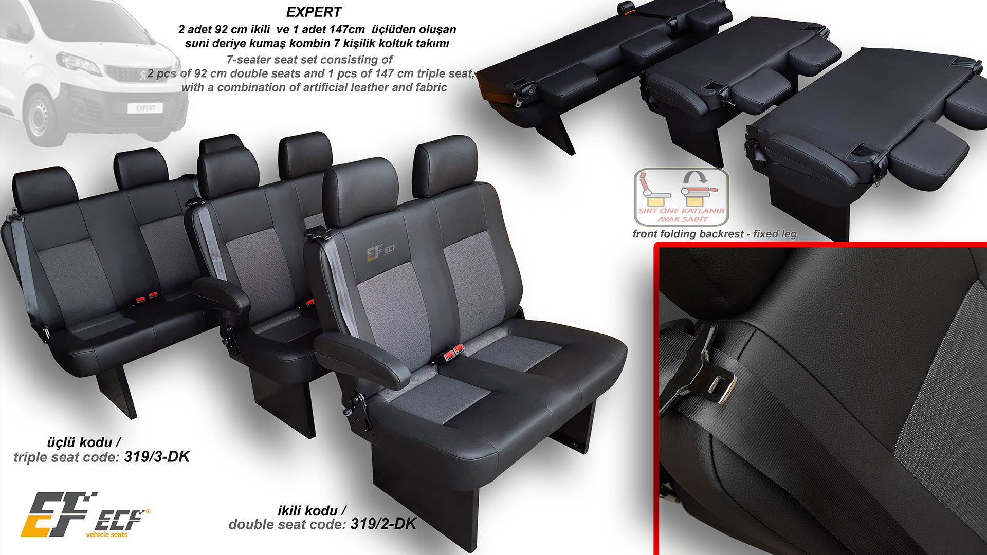 7 seater seat set consisting of 2pcs of 92cm double seats and 1 pcs of 147 cm triple seat, with a combination of artificial leather and fabric