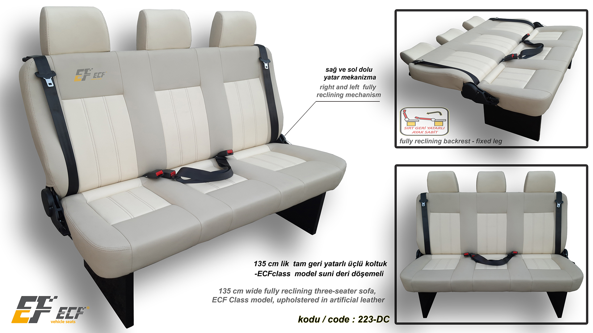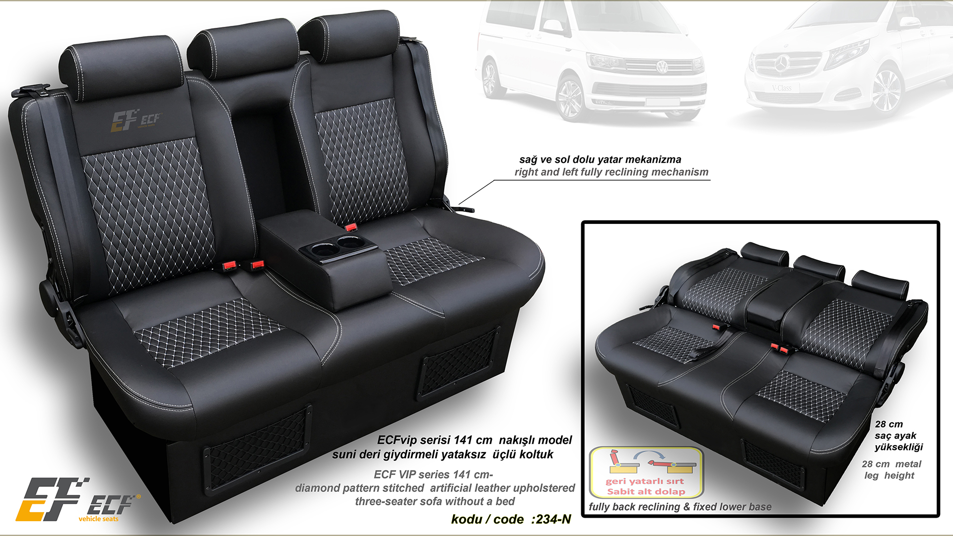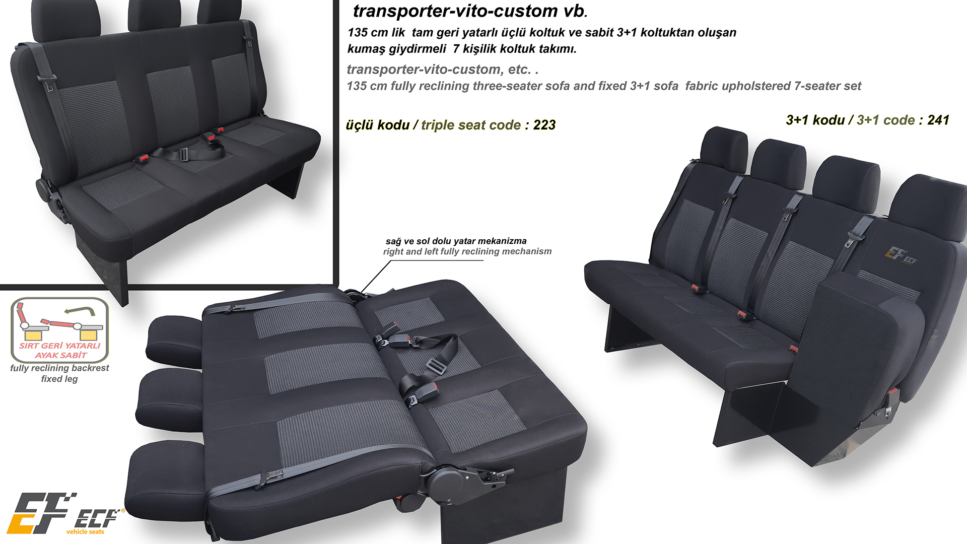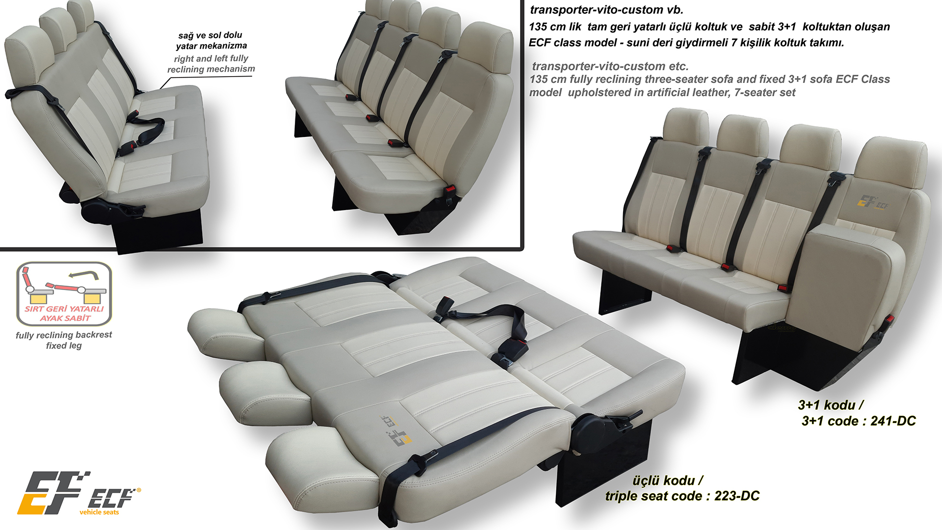 Transporter, Vito, Custom etc 135 cm fully reclining three seater sofa and fixed 3+1 sofa ECF Class model upholstered in artificial leather 7 seater set